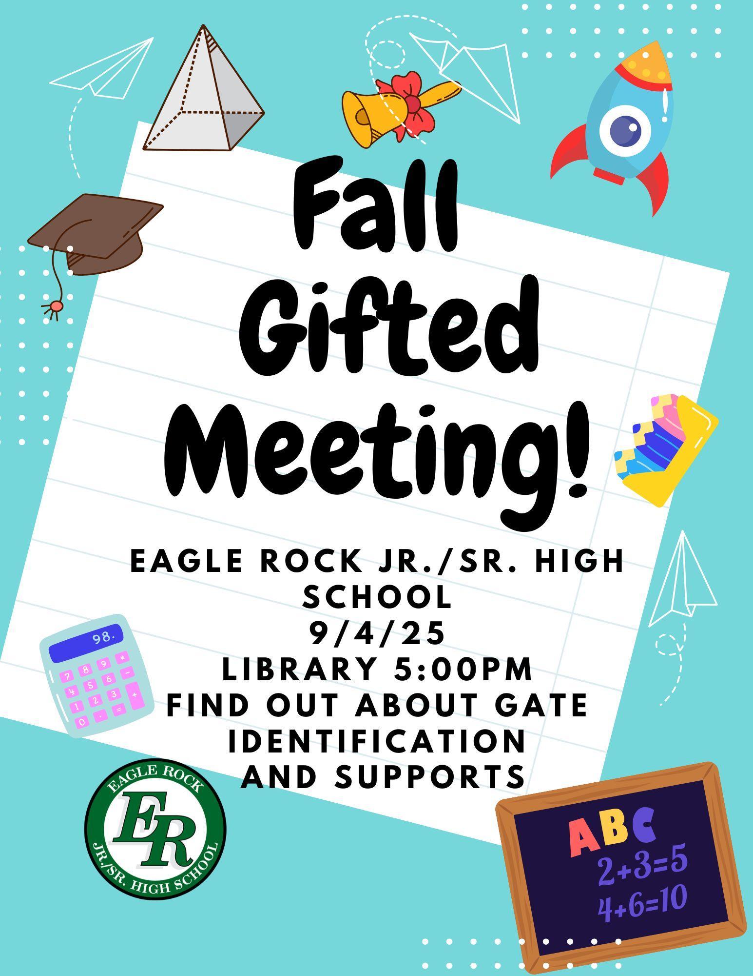 Fall parent GATE meeting 5pm in the library Come learn about GATE identification and how we support GATE learners at the fall parent GATE meeting at 5pm in the library.